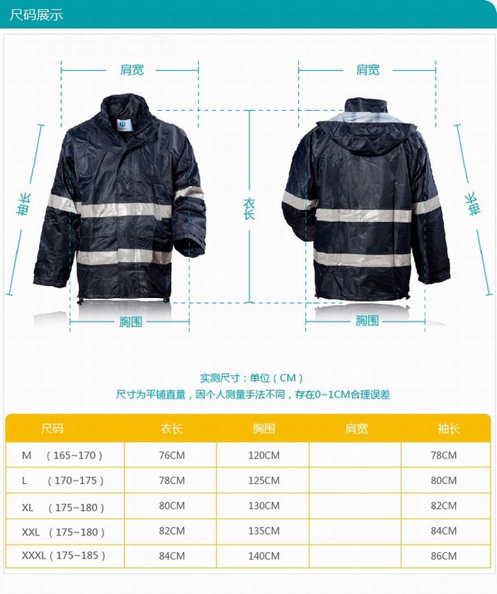 雨衣防护功能:日间可视度高, 夜间可视距离330m,防风、防水、防雨,透气